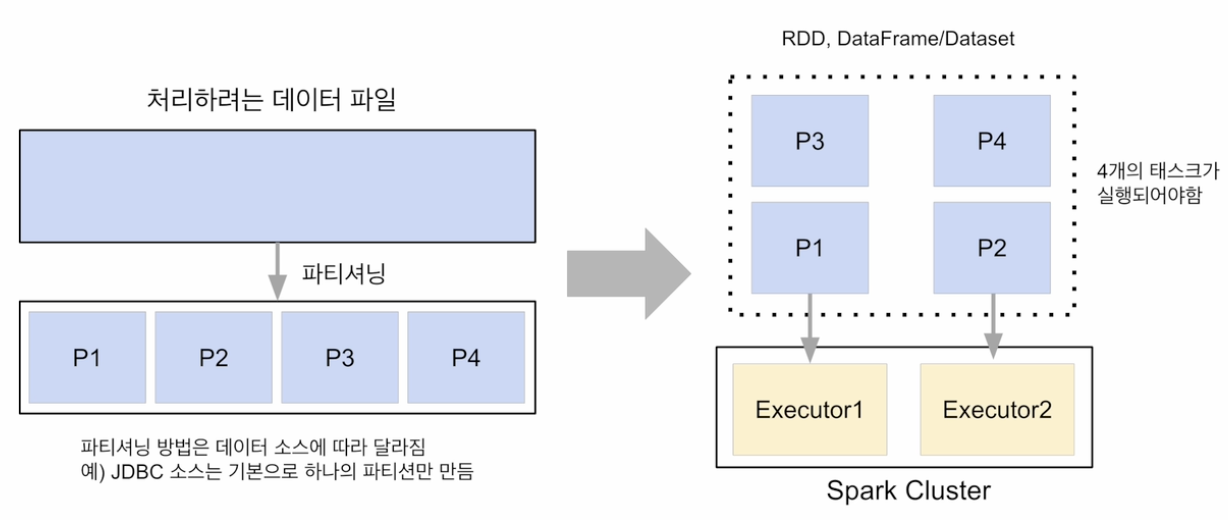 - Spark에서는 파티션 단위로 메모리로 로드되어 Executor가 배정됨