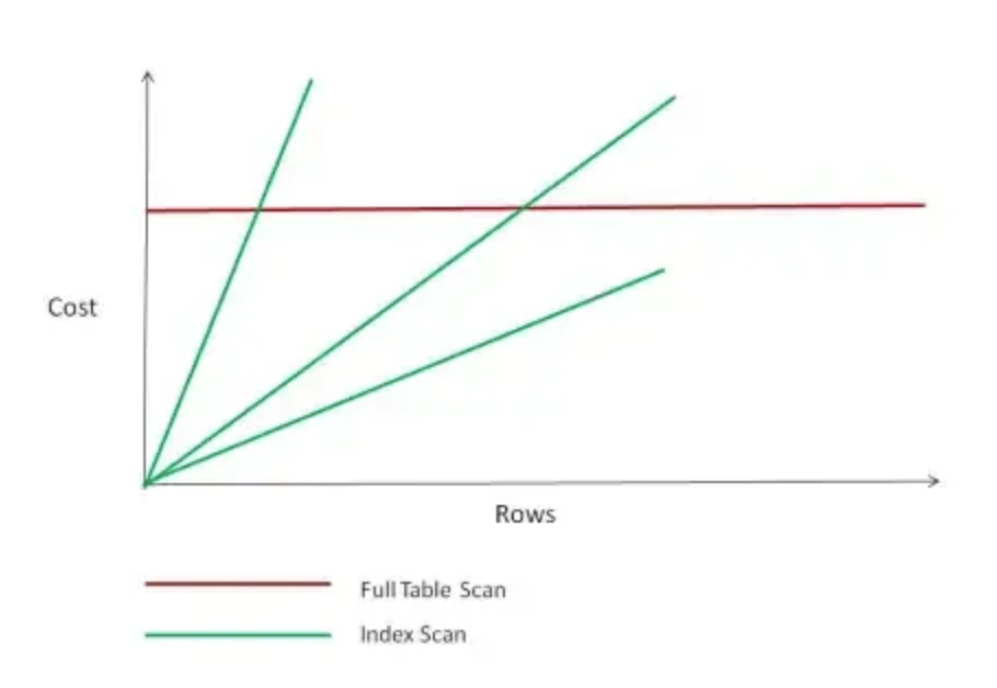 테이블 풀 스캔의 비용은 일정하지만, 인덱스 스캔은 조회 건수에 비례하여 쿼리 구조나 시스템 상황에 따라 변동된다. 이런 변화로 옵티마이저는 어느 지점에서는 인덱스를 사용하지 않는 실행계획을 선택하게 된다.